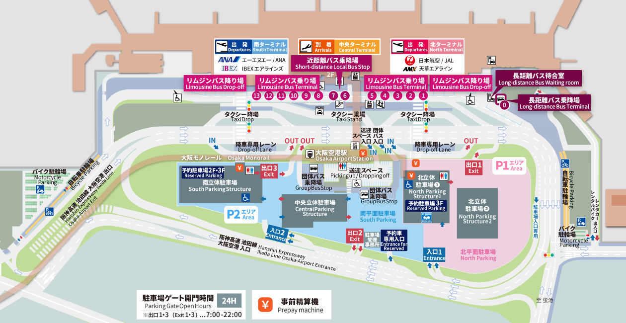 空港から目的地へ 電車 リムジンバス 団体バス 車・駐車場 タクシー レンタカー・レンタルバイク カーシェア・シェアサイクル 駐輪場(自転車・バイク) お探しの情報が選べます 路線・ルート 空港内の乗降場 お探しの情報が選べます 路線・ルート 空港内の乗降場 路線・ルート 大阪・奈良方面 行き先/時刻表のりば所要時間運行会社(リンク先一覧)ユニバーサル・スタジオ・ジャパン 1約40分阪急観光バス / 阪神バス / 近鉄バス関西国際空港 5約70分阪急観光バス / 関西空港交通新大阪駅 8約25分阪急観光バス大阪駅前(梅田) 9約30分阪急観光バス / 阪神バスなんば駅前 10約30分阪急観光バスあべの橋駅(天王寺) 11約30分近鉄上本町駅 12約35分阪急観光バス / 近鉄バス近鉄八尾駅・東大阪長田駅 13約65分阪急観光バス / 大阪バス奈良駅 約80分阪急観光バス / 奈良交通和歌山 0 ※1約2時間大阪バス※1 ⓪番のりば発のバスは予約制です。空港内での乗車券販売はしておりません。 乗車券購入についてはこちらをご確認ください 池田・伊丹方面 行き先/時刻表のりば所要時間運行会社(リンク先一覧)池田方面 6約39分阪急バスJR・阪急伊丹方面 7約15~30分伊丹市交通局 京都方面 行き先/時刻表のりば所要時間運行会社(リンク先一覧)京都駅 2約50分阪急観光バス福知山 0※1約1時間25分日本交通舞鶴 約1時間55分宮津・天橋立・京丹後 約3時間丹海バス ※1 ⓪番のりば発のバスは予約制です。空港内での乗車券販売はしておりません。 乗車券購入についてはこちらをご確認ください > 兵庫・神戸方面 行き先/時刻表のりば所要時間運行会社(リンク先一覧)姫路駅 1約1時間20分神姫バス神戸三宮駅 3約40分阪急観光バス / 阪神バス阪神甲子園駅 4約30分有馬温泉 0※1約30分阪急高速バス神戸三田プレミアム・アウトレット 約40分近鉄バスニジゲンノモリ・淡路島 約1時間58分西日本ジェイアールバス / 本四海峡バス三田方面・ゆりのき台4丁目 ※2約50分神姫バス ※1 ⓪番のりば発のバスは神姫バスを除いて予約制です。空港内での乗車券販売はしておりません。 乗車券購入についてはこちらをご確認ください > ※2 大阪国際空港を経由する神姫バスの乗降について、新大阪発~三田方面行きは乗車可能ですが、三田方面発~新大阪駅行きは降車専用となり乗車はできません。 中国・四国方面 行き先/時刻表のりば所要時間運行会社(リンク先一覧)ニジゲンノモリ・淡路島 1※1約1時間58分西日本ジェイアールバス / 本四海峡バス鳥取 約2時間38分日本交通米子 約3時間13分徳島 約4時間海部観光福山 約4時間10分中国バス ※1⓪番のりば発のバスは予約制です。空港内での乗車券販売はしておりません。 乗車券購入についてはこちらをご確認ください > バスについて 長距離バス ※事前予約制 のりば:⓪空港内での乗車券販売はしておりません。各運行会社のページより事前予約をお願いします。 ※ ⓪番のりば横に、待合室がございます。 空港リムジンバス のりば:①~⑤、⑧~⑬券売機にて乗車券をお買い求めいただくか、交通系ICカードをご準備のうえ、ご希望の行き先ののりばでお待ちください。 ※ 一部運行会社ではICカードに対応しておりません。 近距離路線バス のりば:⑥⑦運賃は、バス車内でお支払いください。 ※ 情報は各機関からの提供を受けておりますが、内容を保証するものではありません。詳細・ご利用については、各運行会社へお問い合わせ下さい。※ 所要時間は大阪国際空港からの目安です。道路状況などにより遅れることがございます。 空港内の乗降場 知っておきたい便利な情報 出発の流れ 保安検査・出国・税関申告などをご案内します。 出発の流れ 到着の流れ 保安検査・入国・税関申告などをご案内します。 到着の流れ 乗り継ぎの流れ 乗り継ぎ時の流れをわかりやすく。 乗り継ぎの流れへ 早朝でもしっかり朝食を 7時前から営業する飲食店をご案内します。ご出発前にお腹も気持ちも満たして。 早朝営業の飲食店一覧へ