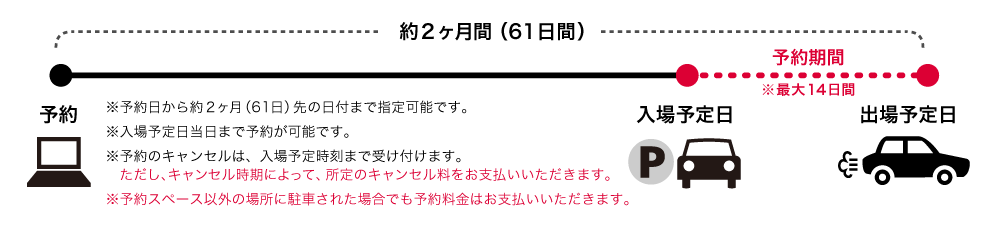 | 予約可能期間 | 14日間以内 ※ 入出場日が同日となる日帰りのご利用も可能です。 |