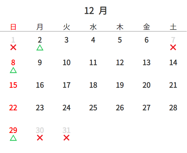 | 不可 | 12月6日 | ~ | 12月9日 | 入庫日から出庫日の間(7日)に「×」があるため不可 |