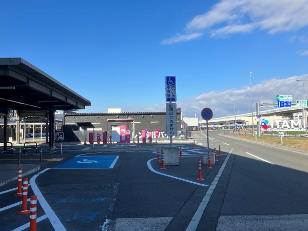 旅客ターミナル前に「障がい者等専用乗降場」、送迎スペース・駐車場内に「障がい者等専用スペース」がございます。