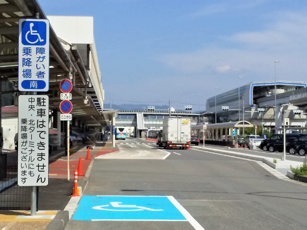 旅客ターミナル前の側道の南側、北側及び中央(バス停⑦と⑧の間)に、それぞれ1カ所の「障がい者等専用乗降場」があります。