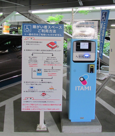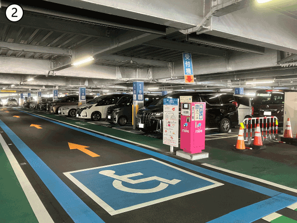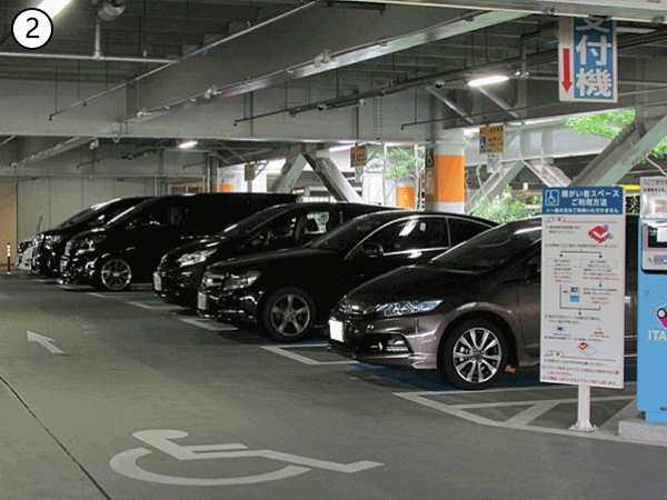 駐車場内の「障がい者等専用スペース」は、南立体駐車場(15台)、北立体駐車場①(19台)、駐車場管理事務所付近(4台)にございます。 駐車場入口から入庫し、各「障がい者等専用スペース」へお進みください。