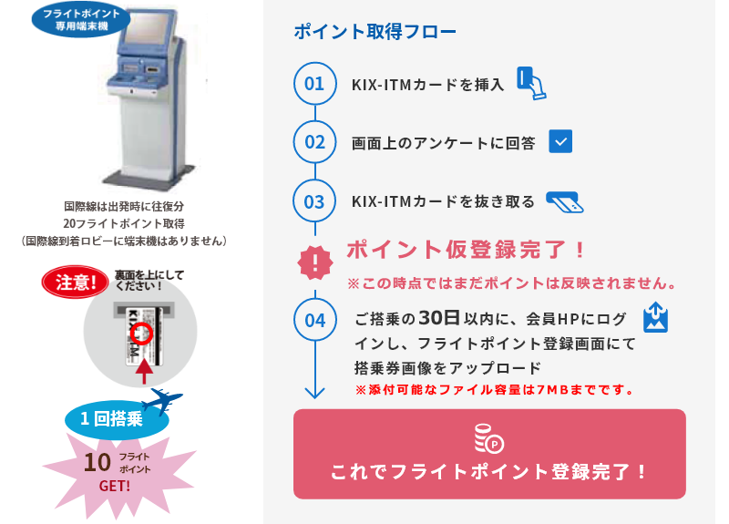 - 磁気不良により加算できなかった場合、国際線の到着のみ関西空港を利用された場合、同日に3回以上関西国際空港のご搭乗があった場合のポイントにつきましては、関西国際空港内KIX-ITMカードカウンターで事後登録を承ります。 また、会員専用ページからもご申請依頼いただけます。(搭乗より180日以内に限る)