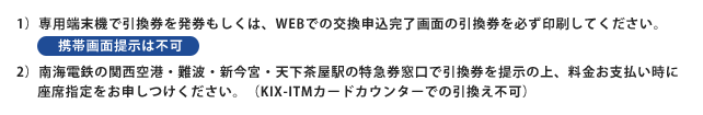 WEBで交換の場合 ➡ 会員ページにログインし、会員メニューの「特典交換」を選び、「ラピート割引引換券受付票」を印刷の上、南海窓口にお持ちください。