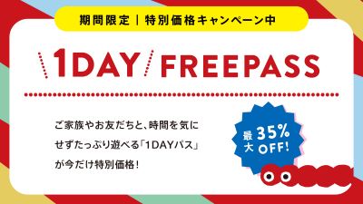 ご家族やお友だちと、時間を気にせずたっぷり遊べる【1DAYパス】が特別価格でご利用いただける期間限定キャンペーン開催中!お得なパスは毎日枚数限定で発売!ぜひご利用ください。